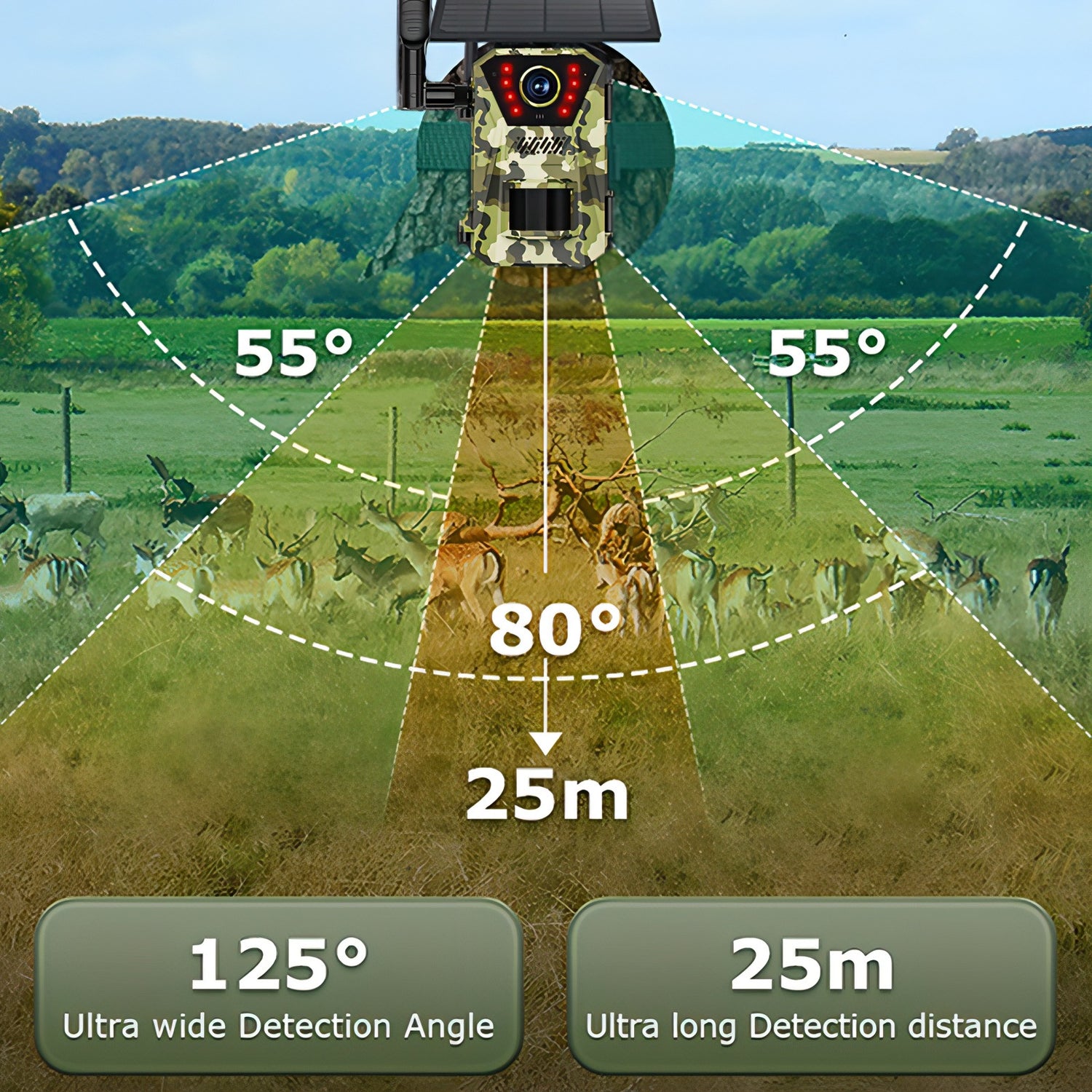 The camera is powered by solar energy, ensuring continuous operation year-round without frequent battery changes. Energy efficient and environmentally friendly, perfect for long-term surveillance.
